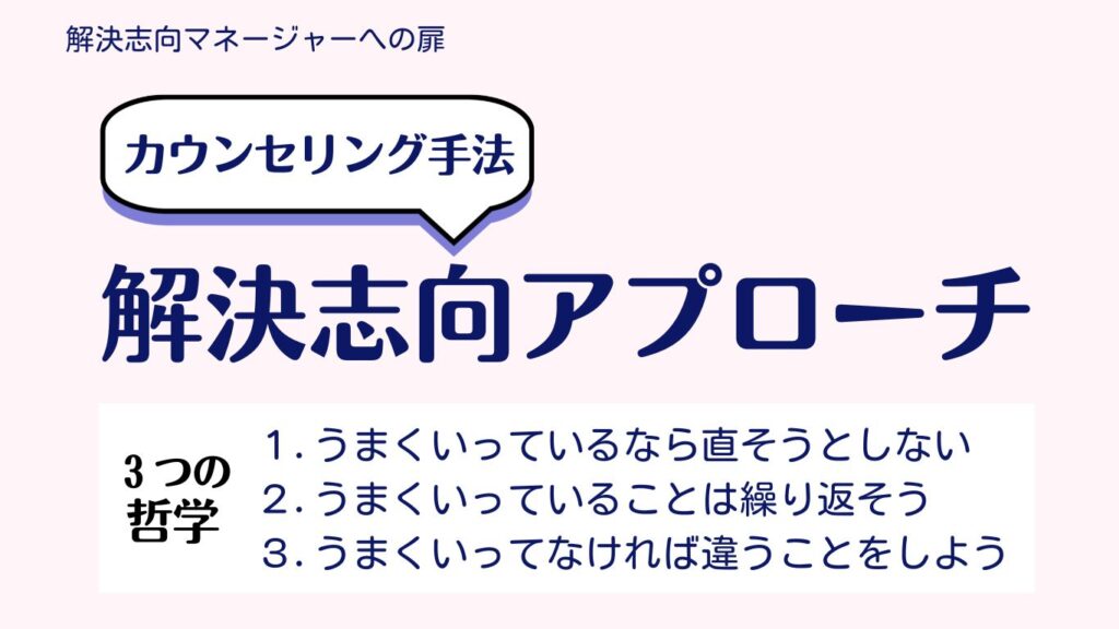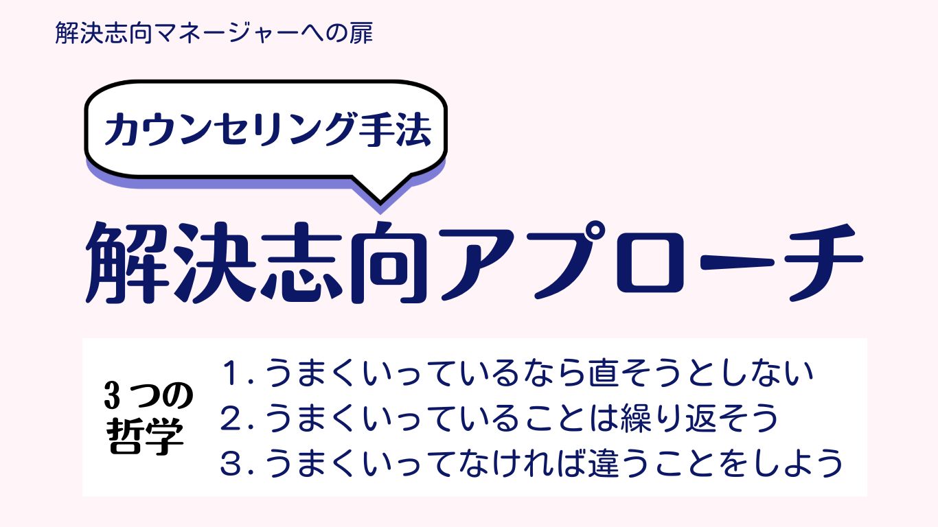 ここでの解決志向は、カウンセリング手法の一つ解決志向アプローチがベースとなっています。ここではエッセンスを記載しておきます。これだけでもカンの良い人は解決志向を使いこなしていけますよ。